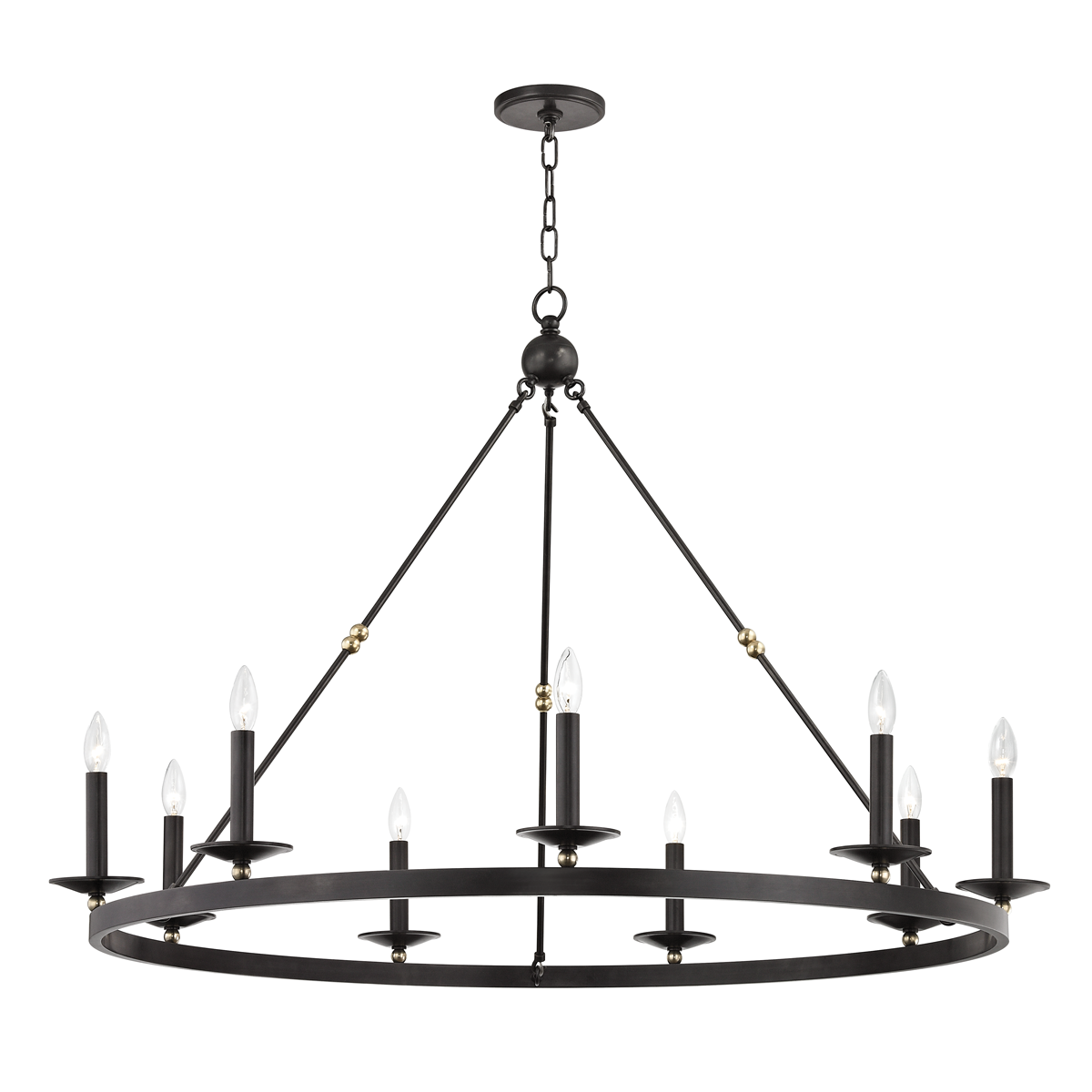 Streamlining a wagon-wheel chandelier with hook-and-hoop rods, Allendale breathes new life into a classic. Available in one-to-three-tier and rectangle versions, its sphere details and vastly different finishes refine the rustic.