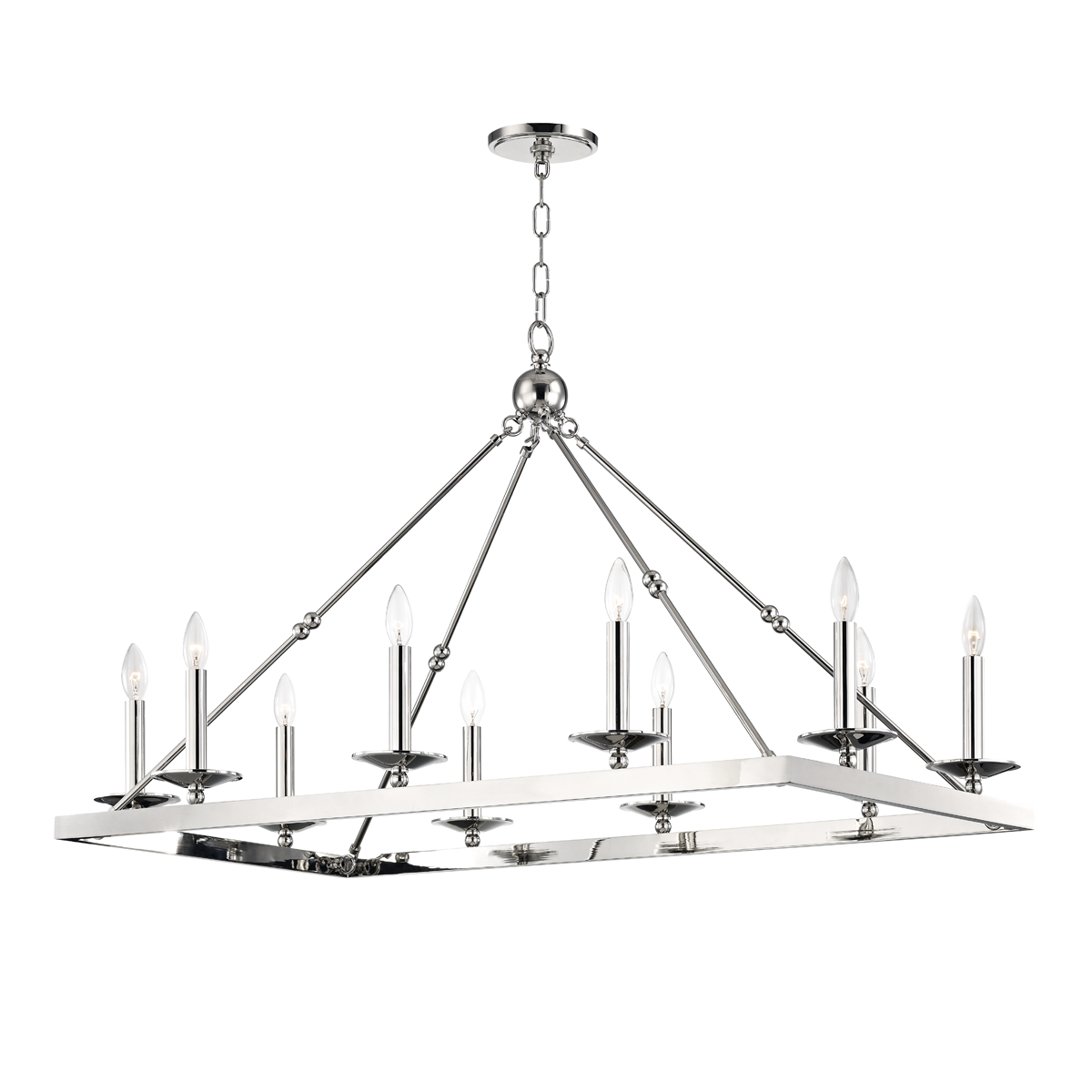 Streamlining a wagon-wheel chandelier with hook-and-hoop rods, Allendale breathes new life into a classic. Available in one-to-three-tier and rectangle versions, its sphere details and vastly different finishes refine the rustic.