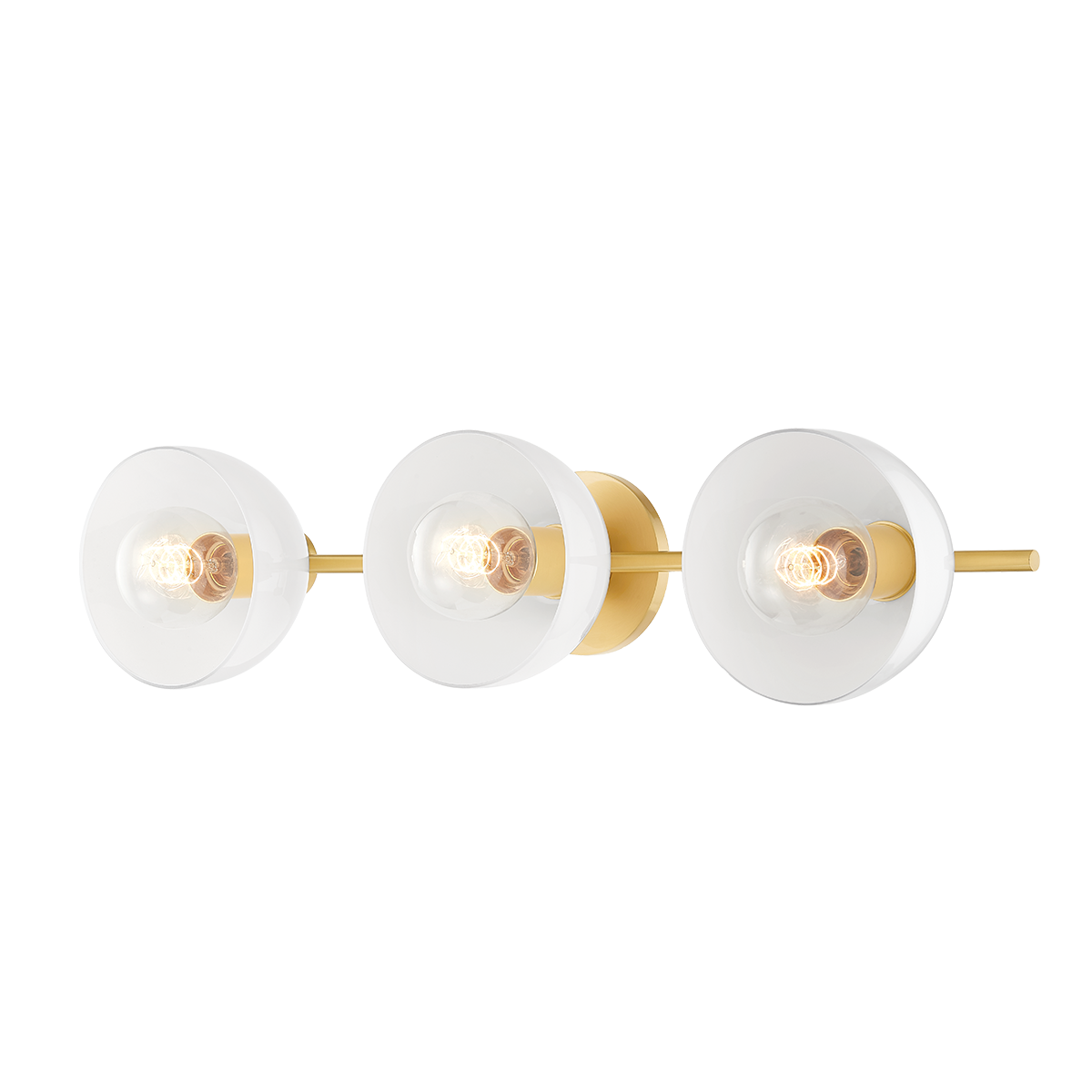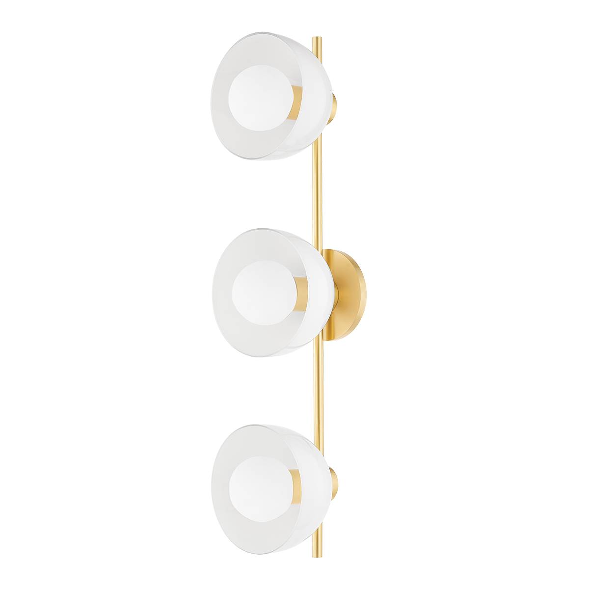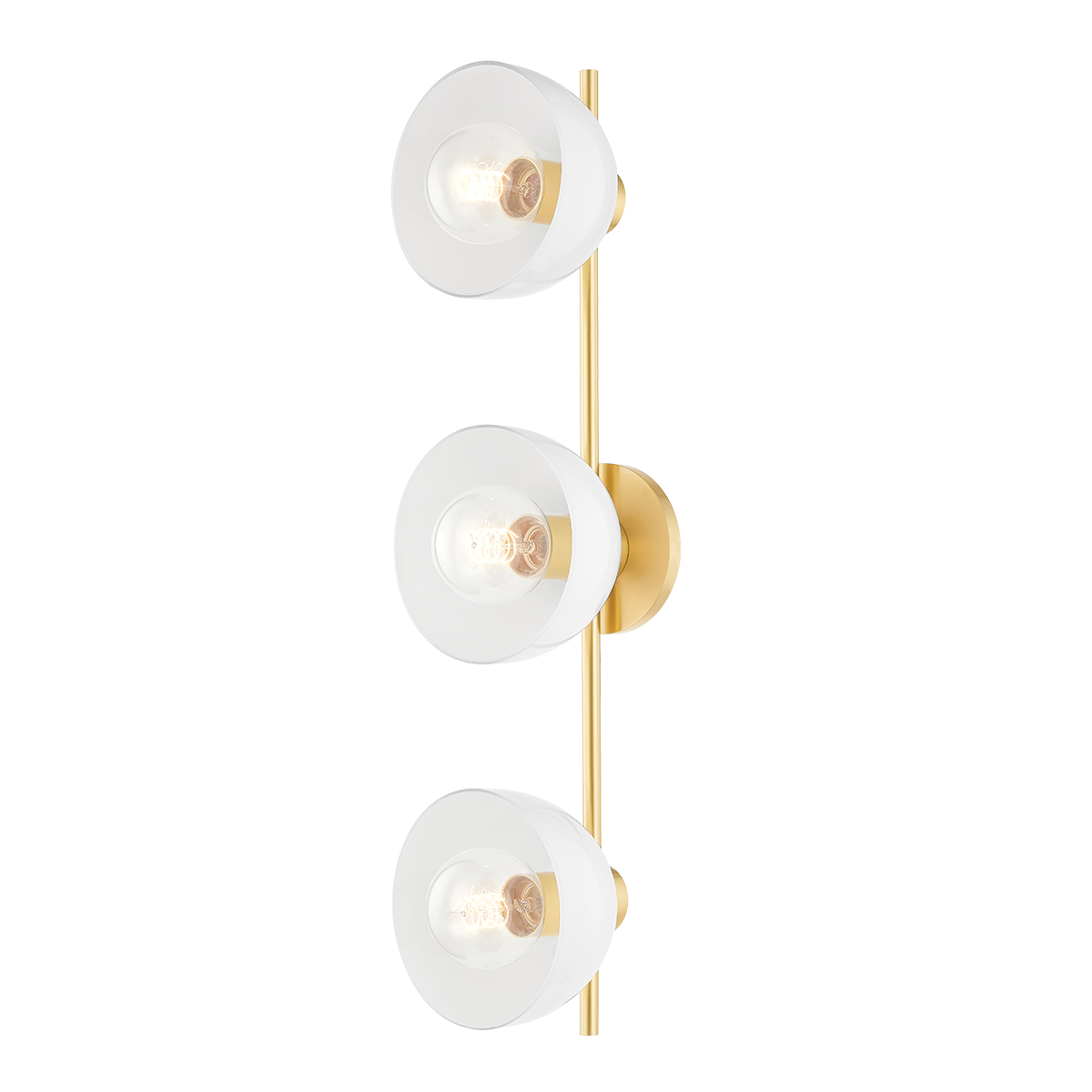 Cool contrast and fine form play well together in Belle's striking silhouette. The aged brass frame pops against the glossy white shades, featuring exposed bulbs for a futuristic effect. Available as a chandelier, linear, 1 or 3-light wall sconce, and floor lamp.