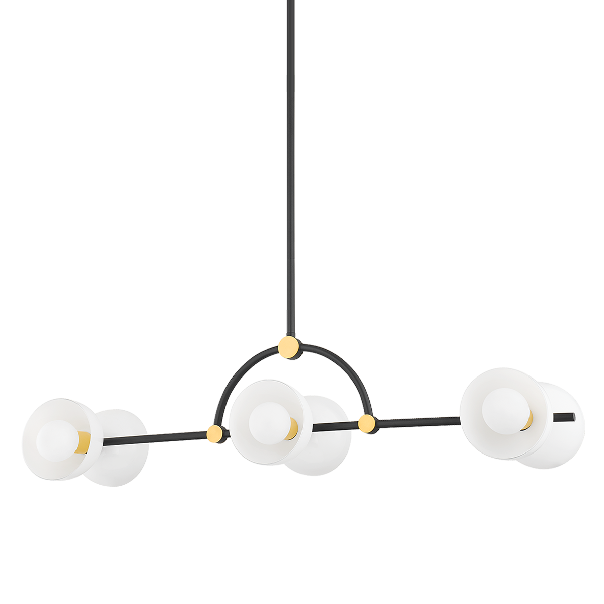 Cool contrast and fine form play well together in Belle's striking silhouette. The aged brass frame pops against the glossy white shades, featuring exposed bulbs for a futuristic effect. Available as a chandelier, linear, 1 or 3-light wall sconce, and floor lamp.