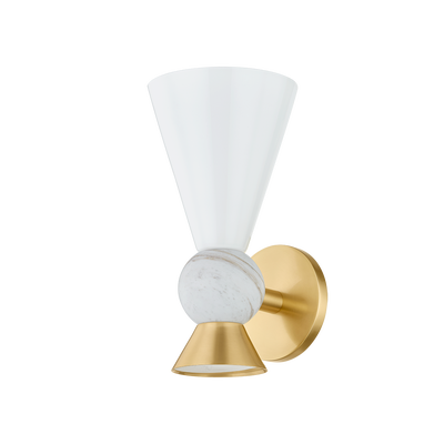 Simple yet elevated, the totemic silhouette of Mona makes a playful first impression. Stacked between a large opal shiny glass shade and a tapered Aged Brass cuff is a striking Calacatta gold marble sphere. When viewed from the front, the Aged Brass back panel encircles the marble like a halo, completing the puzzle-like composition. Part of our Megan Molten x Mitzi Tastemakers collection.