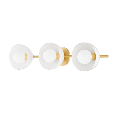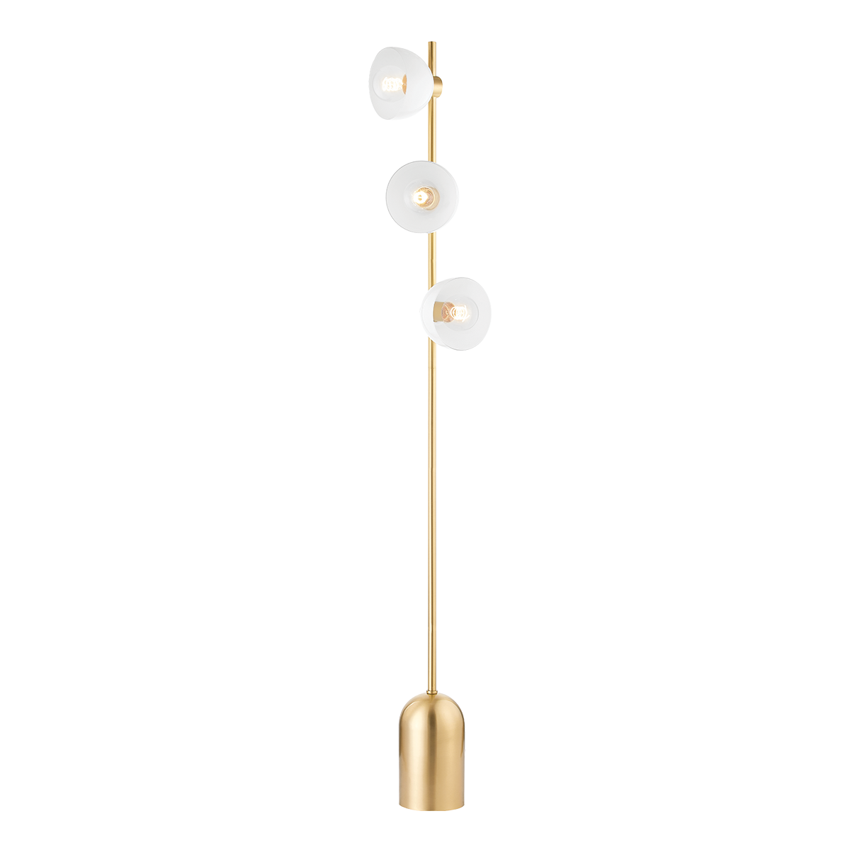 Cool contrast and fine form play well together in Belle's striking silhouette. The aged brass frame pops against the glossy white shades, featuring exposed bulbs for a futuristic effect. Available as a chandelier, linear, 1 or 3-light wall sconce, and floor lamp.