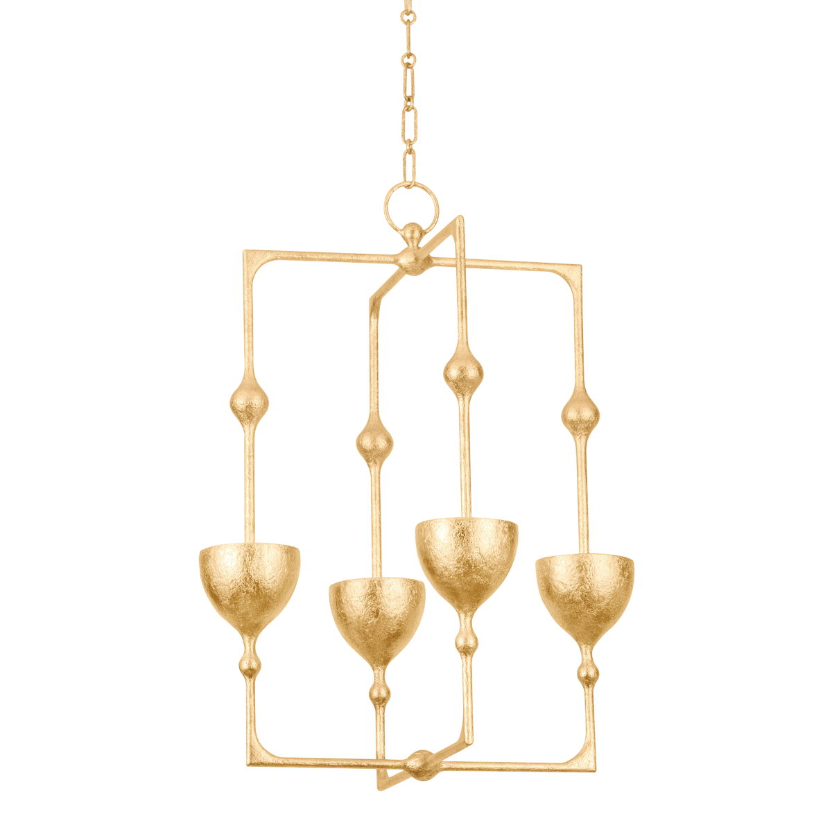Drawing inspiration from the geometric patterns of Turkish tiles, this LED fixture merges high-concept design with otherworldly beauty. Long biomorphic stems support inverted bowl shades that direct light upwards. Available as a sconce or lantern in two sizes with the choice of a fresh Gesso White or luxurious Vintage Gold Leaf finish.