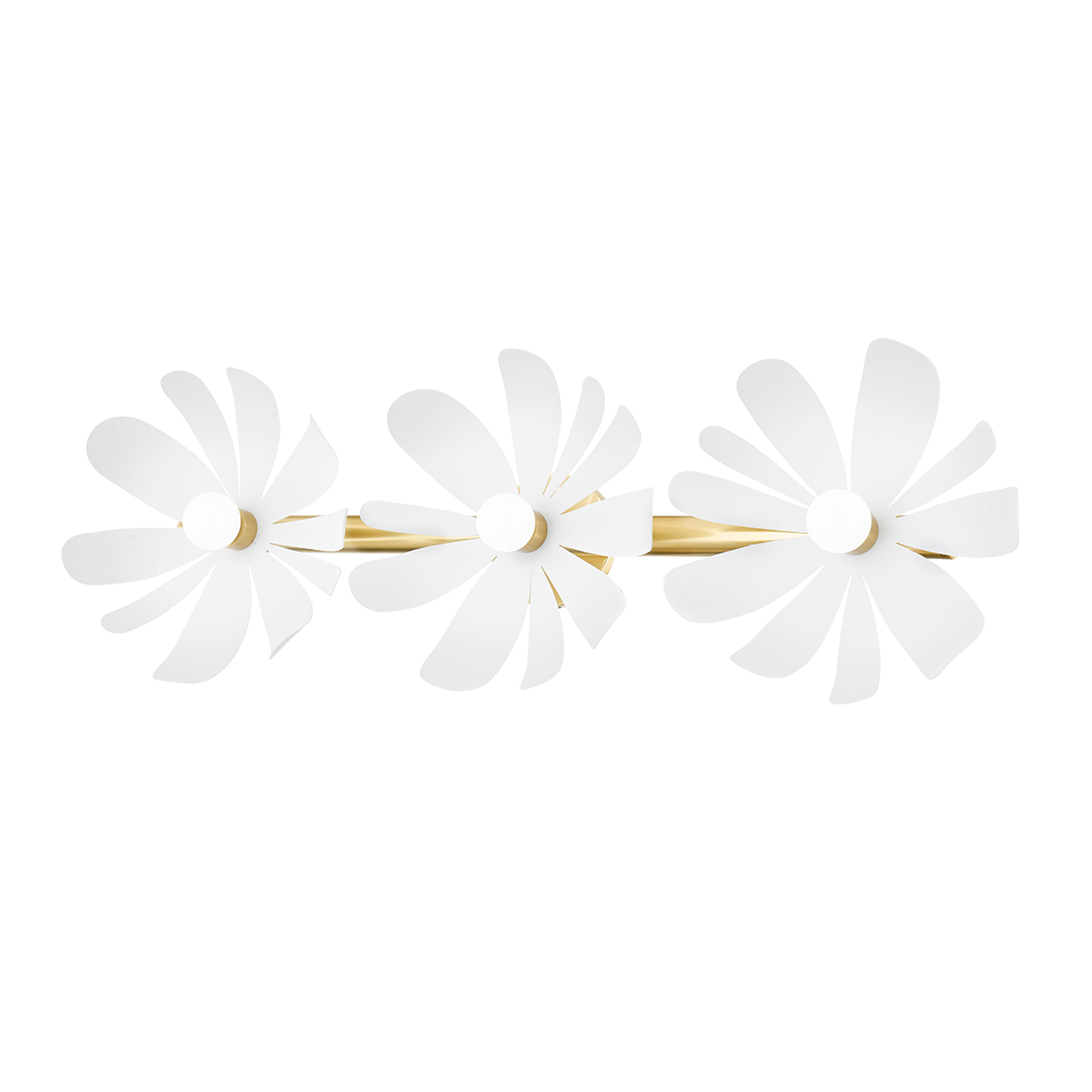 Pretty with a retro flair, Twiggy is floral inspiration at its finest. Different-sized textured white petals sprout from a petite opal matte bulb at the center. The aged brass accents add a pop of shine without taking away from the piece's organic feel. Twiggy offers an entire bouquet of options including a one- or three-light wall sconce, a 3-light semi flush and a 3-light floor lamp.