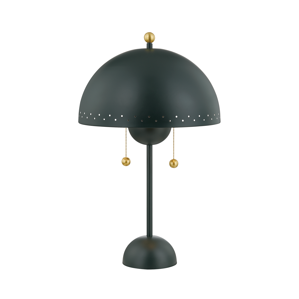 Influenced by midcentury design, Jojo features a dome-shaped shade with decorative perforations that allow light to escape. Both the pendant and sconce come in a Soft White finish while the lamp is available in a moody green as an eye-catching accent piece. The pendant features 2 lights within its bowl, optimizing illumination. All variations are elegantly accented in Aged Brass. Part of our Zoe Feldman collection.