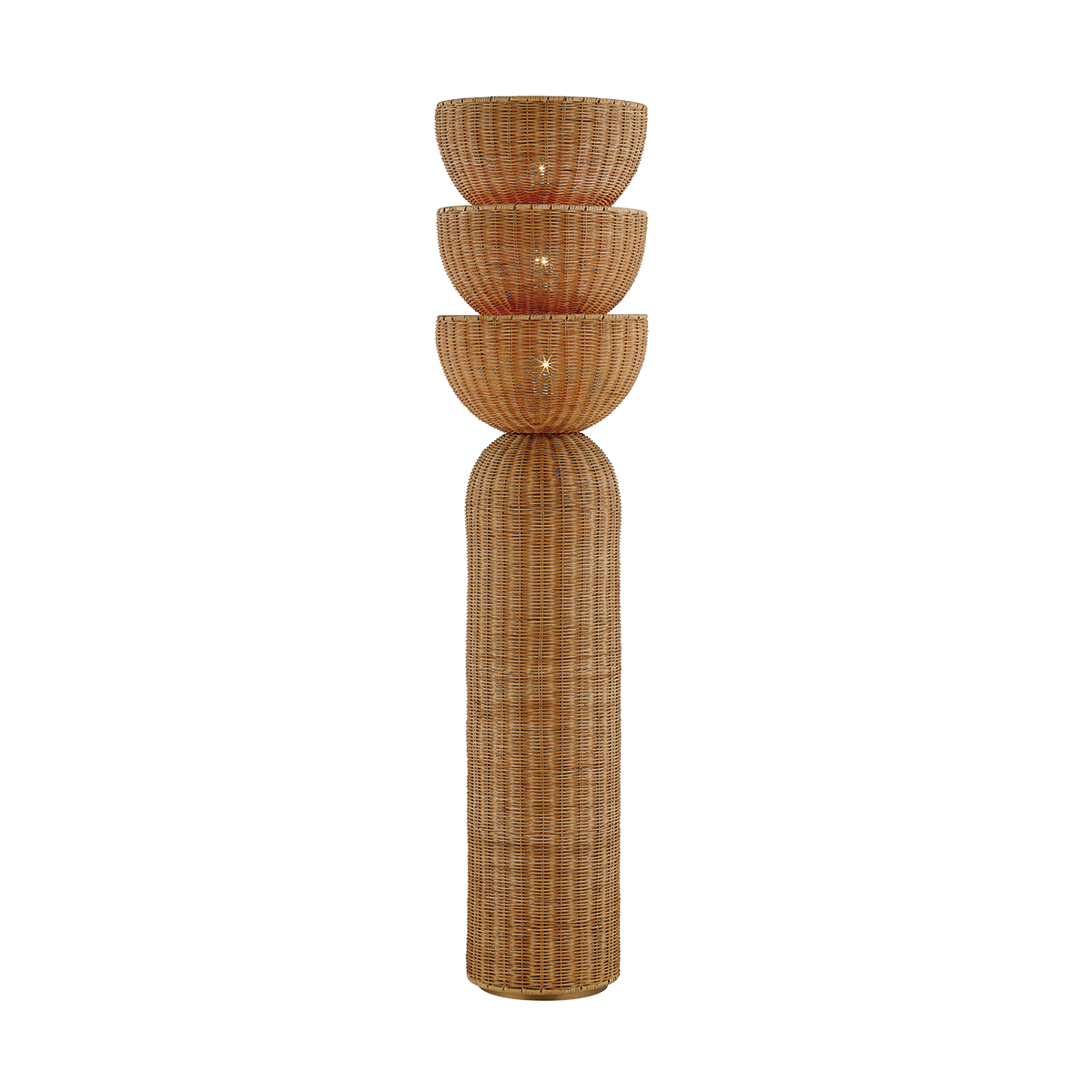 Repetitive geometric shapes drawn from mid-century motifs create an eye-catching totemic stack in the Rian floor lamp. Each natural wicker bowl is individually lit, allowing a soft diffusion of light through the textural weave. With an impressive height of 55 inches, this 3-light floor lamp makes for a striking sculptural addition to any room.<br /><br />*Due to the one-of-a-kind nature of the medium, exact colors and patterns may vary slightly from the image shown.